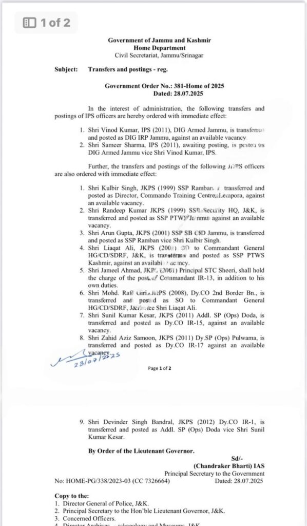JAMMU, July 28: Lieutenant Governor Jammu and Kashmir Manoj Sinha toady ordered transfers and postings of DIG , SSP Rank Police Officers ; Sameer Sharma DIG Armed , Arun Gupta SSP Ramban.