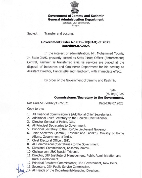 Jammu, July 09: Chief Minister Jammu and Kashmir  ordered transfer/posting of JKAS Officer Mohammad Younis.