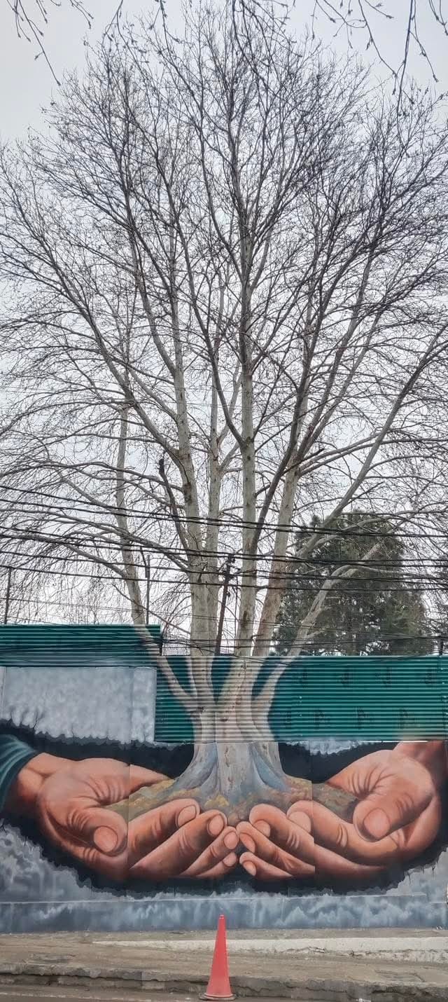 Another striking mural presents a large tree emerging from human hands, symbolizing care, protection, and shared responsibility. The painting reflects the idea that the future of greenery and ecological balance depends entirely on human actions. It conveys that when people nurture nature, it thrives and continues to support life for generations.