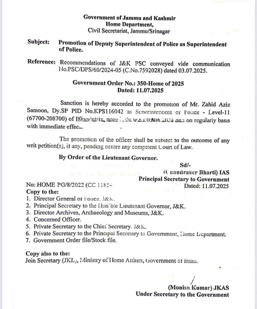 HomeJammuLG J&K orders promotion of DySP as Superintendent of Police Jammu LG J&K orders promotion of DySP as Superintendent of Police By Jammu Herald NewsRoom 11 July 2025 Share FacebookTwitterPinterestWhatsApp JAMMU, July 11: LG J&K Manoj Sinha ordered promotion of DySP as Superintendent of Police. Share FacebookTwitterPinterestWhatsApp Previous articlePolice attach property worth Rs 1 Cr under NDPS Act in SrinagarNext articlePakistan Looks To Formulate Stricter Regulations For Foreign Satellite Operators Jammu Herald NewsRoomhttps://jammuherald.com/ RELATED ARTICLES Jammu J&K Govt Directs DDOs to Ensure Strict Compliance in Works Contract Payments 7 March 2026 Jammu Global Oil Prices Surge 9% Amid US–Israel Strikes on Iran; Retail Fuel Prices in India Likely to Remain Stable 3 March 2026 Jammu Above-Normal Heatwave Days Likely from March to May Across Most Parts of India: IMD 28 February 2026 LEAVE A REPLY Cancel reply Comment: Please enter your comment! Name:* Please enter your name here Email:* You have entered an incorrect email address! Please enter your email address here Website: Save my name, email, and website in this browser for the next time I comment. - Advertisment - Most Popular J&K Govt Directs DDOs to Ensure Strict Compliance in Works Contract Payments 7 March 2026 Missile Strikes Escalate as Iran and Israel Trade Attacks; Global Tensions Rise 7 March 2026 Hindu Mahasabha Seeks Action Against Kamaraj for Allegedly Defaming Isha 5 March 2026 Nitish Announces Rajya Sabha Foray, Ending Tenure As Bihar’s Longest-Serving CM 5 March 2026 Load more