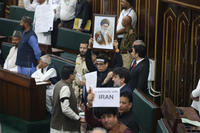 National Conference (NC) leaders, led by Tanvir Sadiq, on Friday staged a protest outside the Jammu and Kashmir Legislative Assembly expressing solidarity with Iran amid the ongoing Middle East crisis.